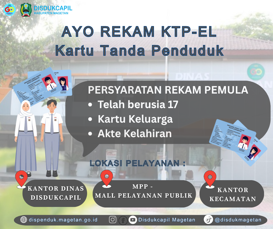 Himbauan PEREKAMAN KTP-EL, bagi masyarakat Magetan yang saat ini telah berusia 17 tahun untuk segera melakukan perekaman KTP-EL, agar tidak berdampak pada akses pelayanan publik lainnya.